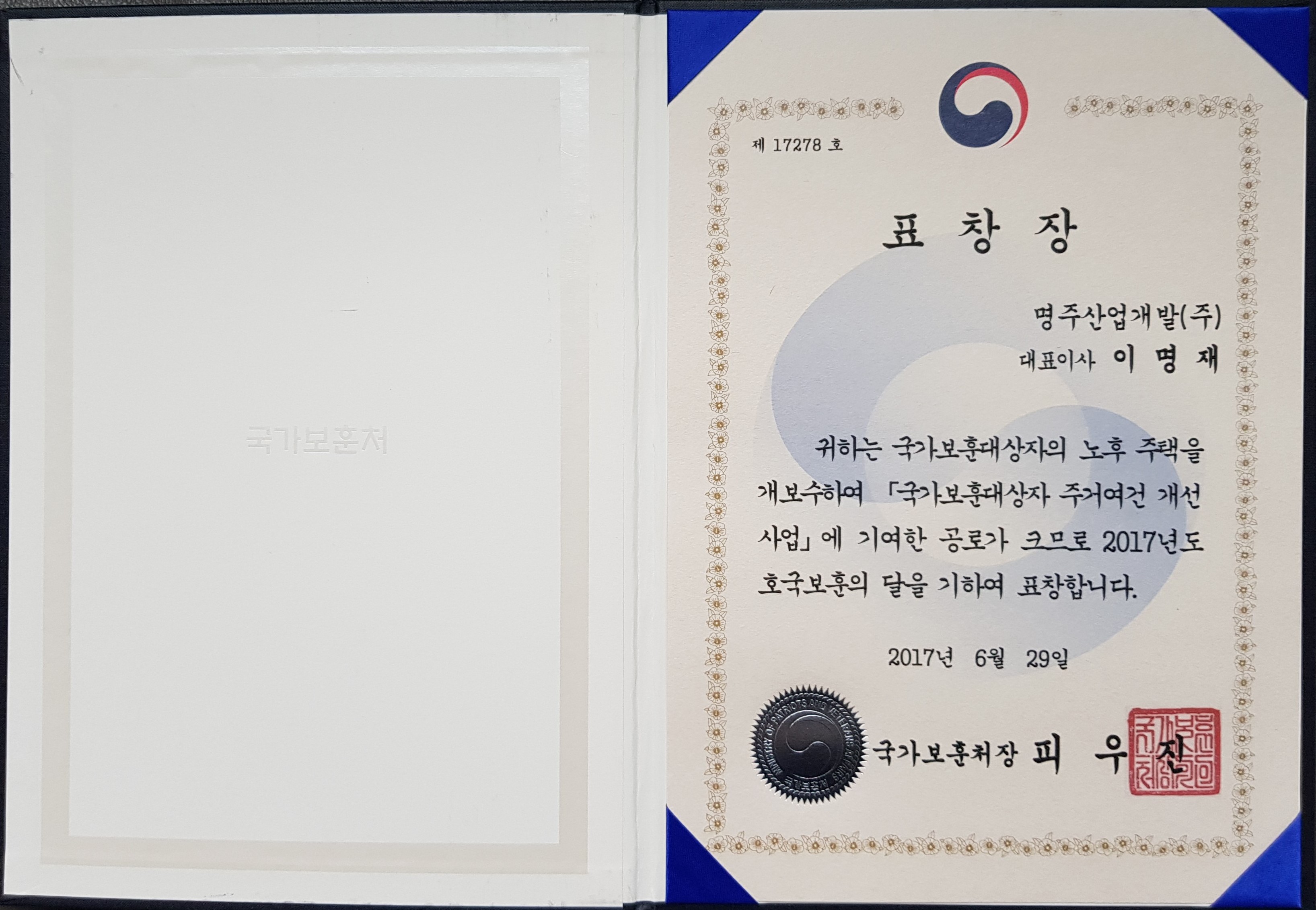 국가보훈처장 표창장